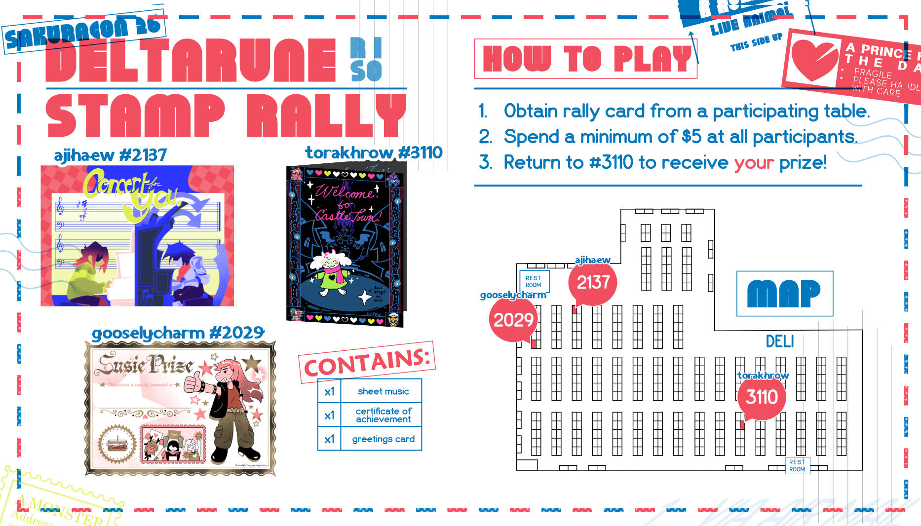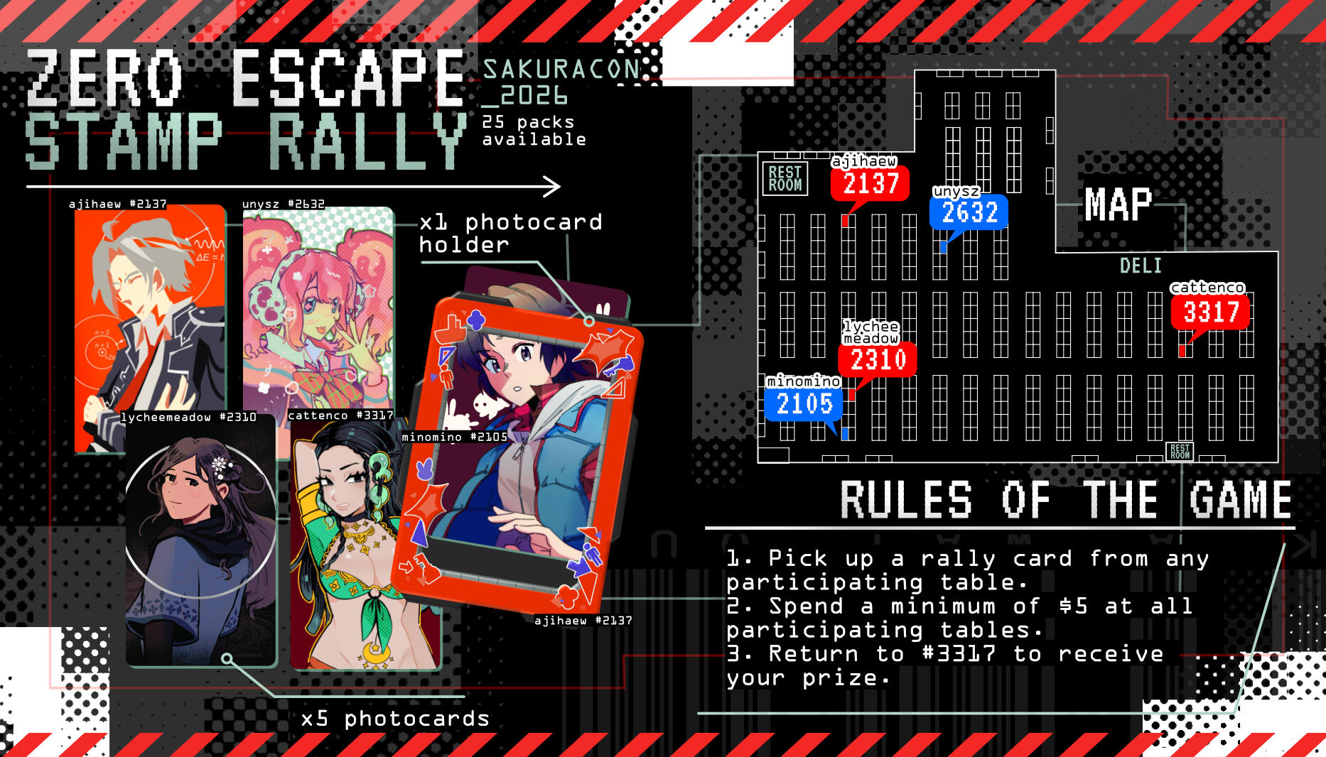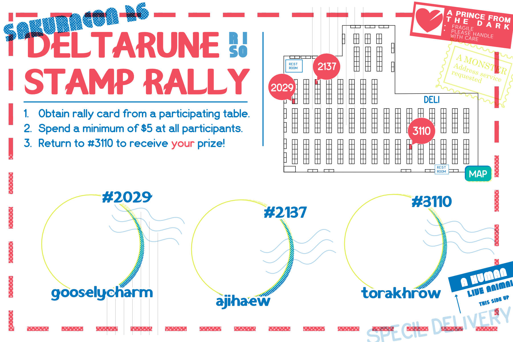Stamp RalliesVariety of stamp rally events across convention appearances. Collaborative works with other artists and exhibitors across different themes where each artist creates a work as part of a "prize pack" after visiting/purchasing from each participating table. Artworks are created under a theme, and graphics are created to fit with the theme and create eye-catching but legible signage in person and online.
