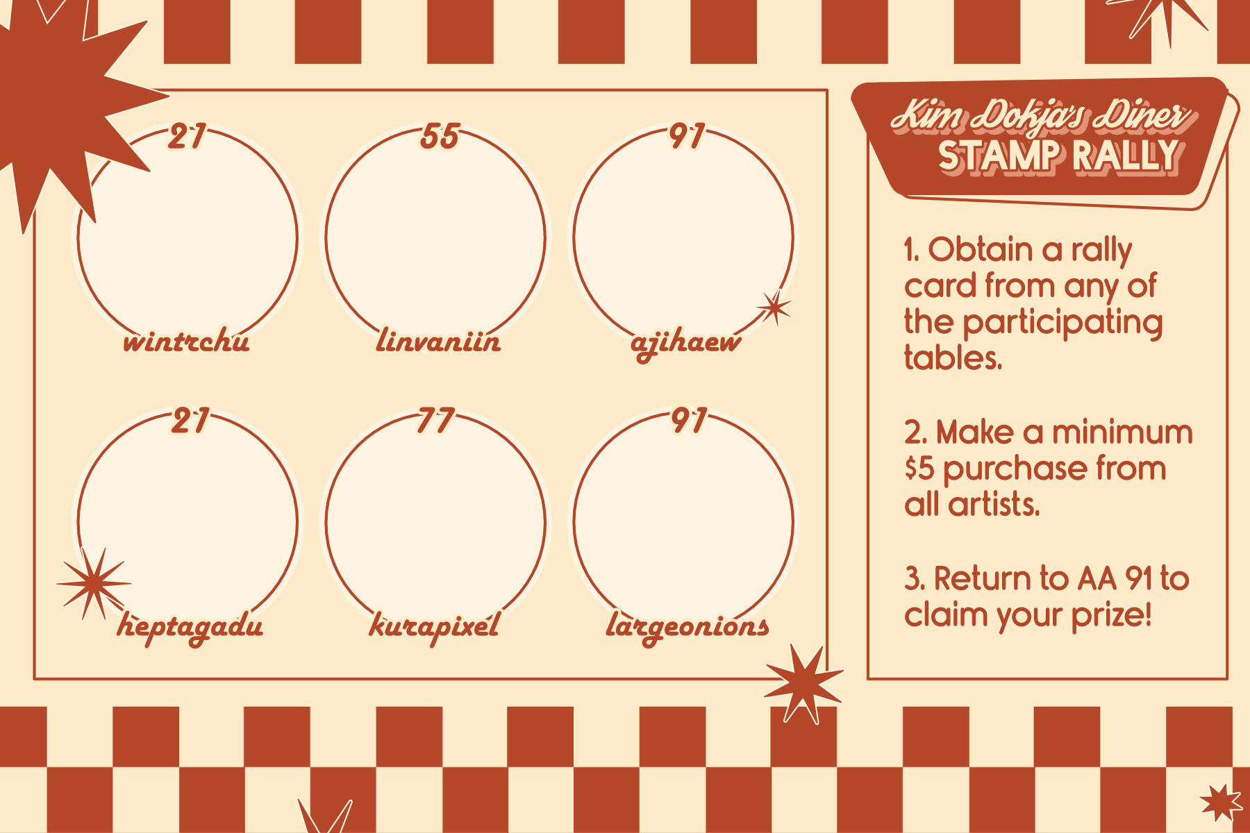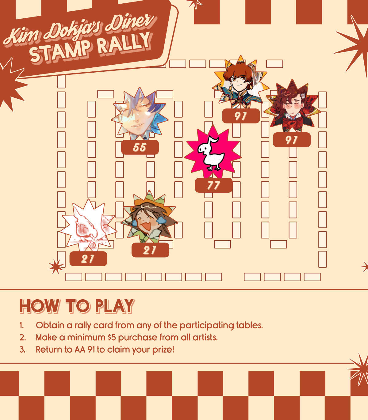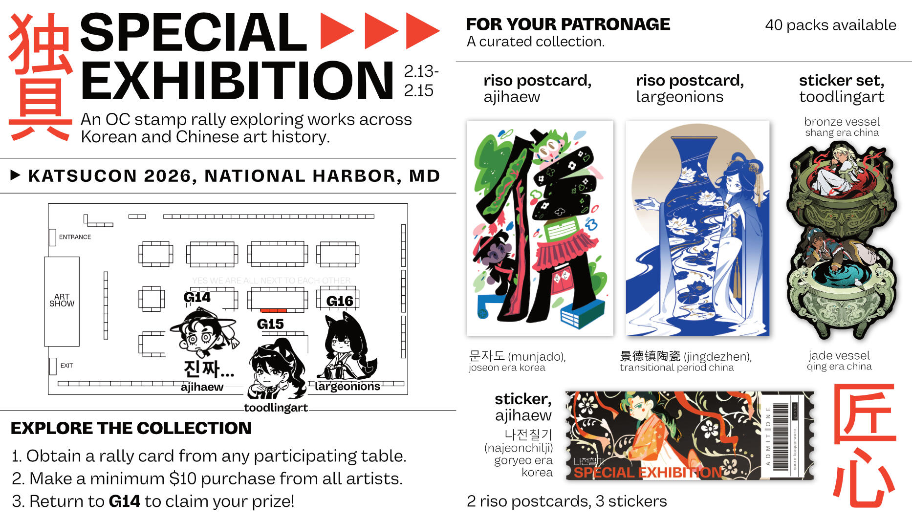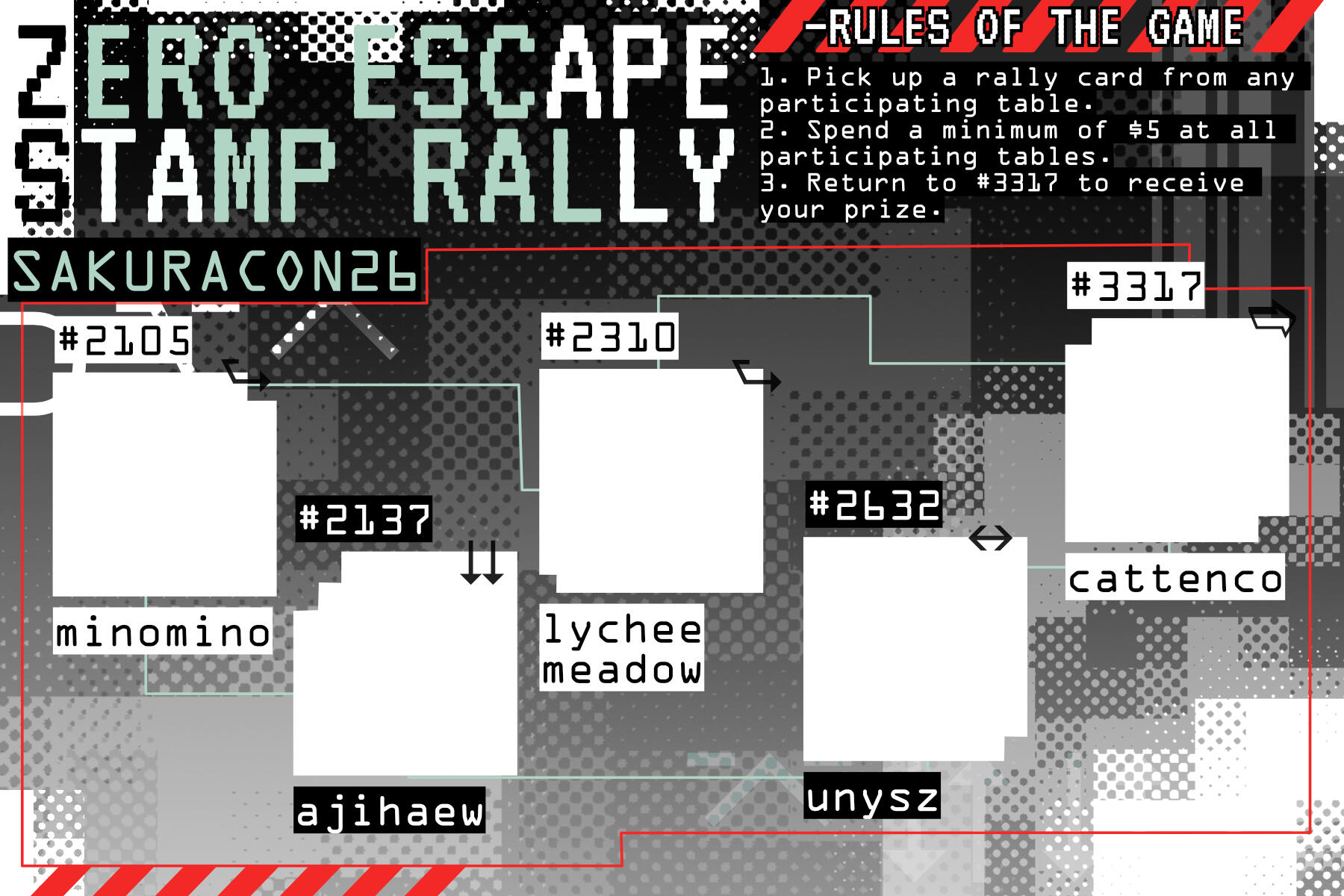 Stamp RalliesVariety of stamp rally events across convention appearances. Collaborative works with other artists and exhibitors across different themes where each artist creates a work as part of a "prize pack" after visiting/purchasing from each participating table. Artworks are created under a theme, and graphics are created to fit with the theme and create eye-catching but legible signage in person and online.